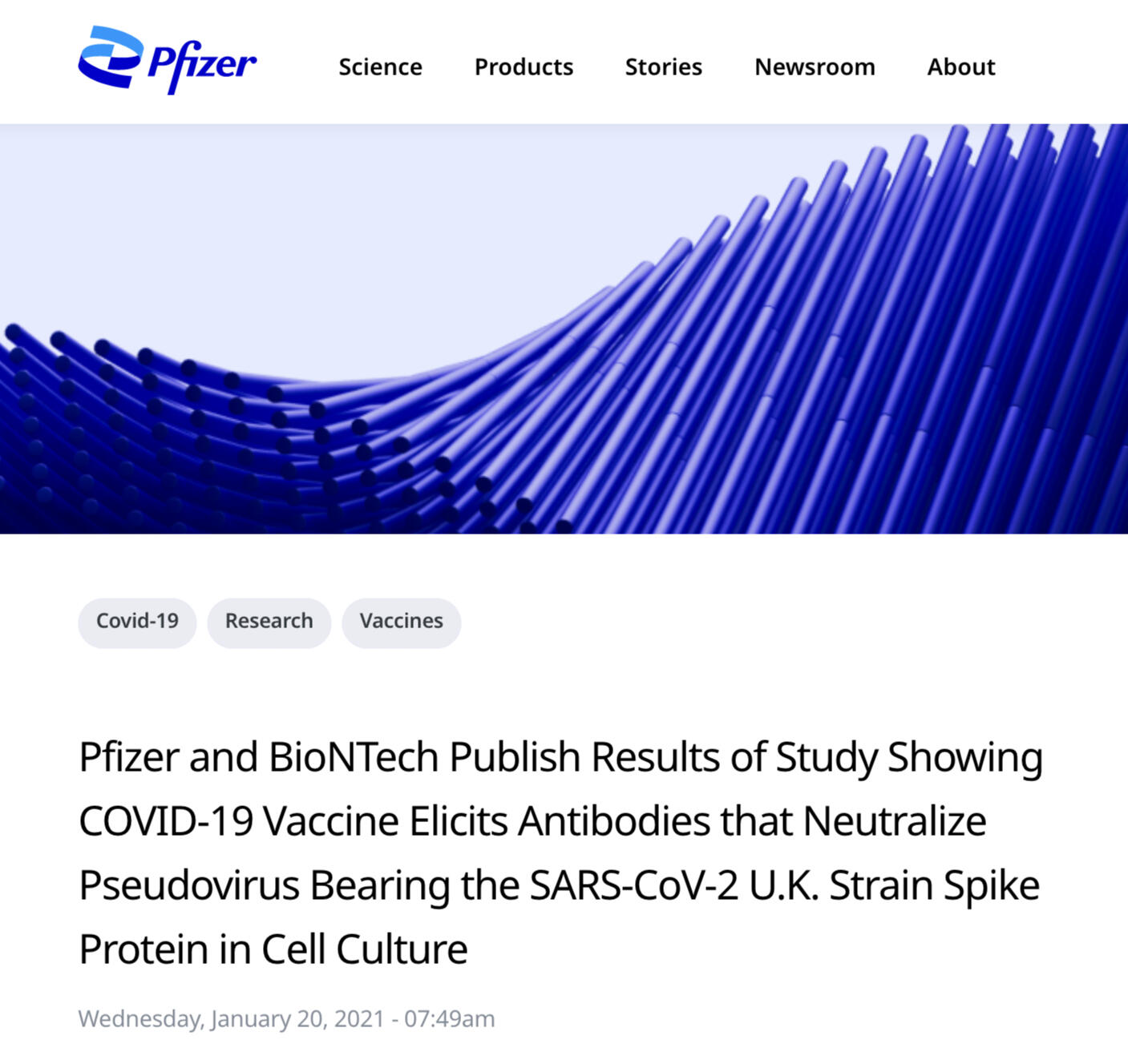 - Jan. 20/21. Press Release: PFIZER AND BIONTECH PUBLISH RESULTS OF STUDY SHOWING COVID-19 VACCINE ELICITS ANTIBODIES THAT NEUTRALIZE PSEUDOVIRUS BEARING THE SARS-COV-2 U.K. STRAIN SPIKE PROTEIN IN CELL CULTURE.