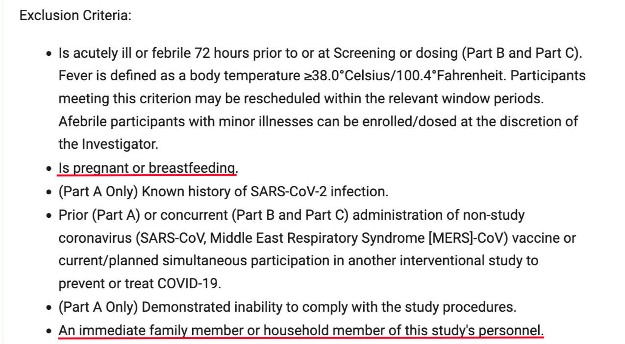 - An immediate family member or household member of this study's personnel. (ie. Moderna employees and their families are exempt from taking the deadly jab).