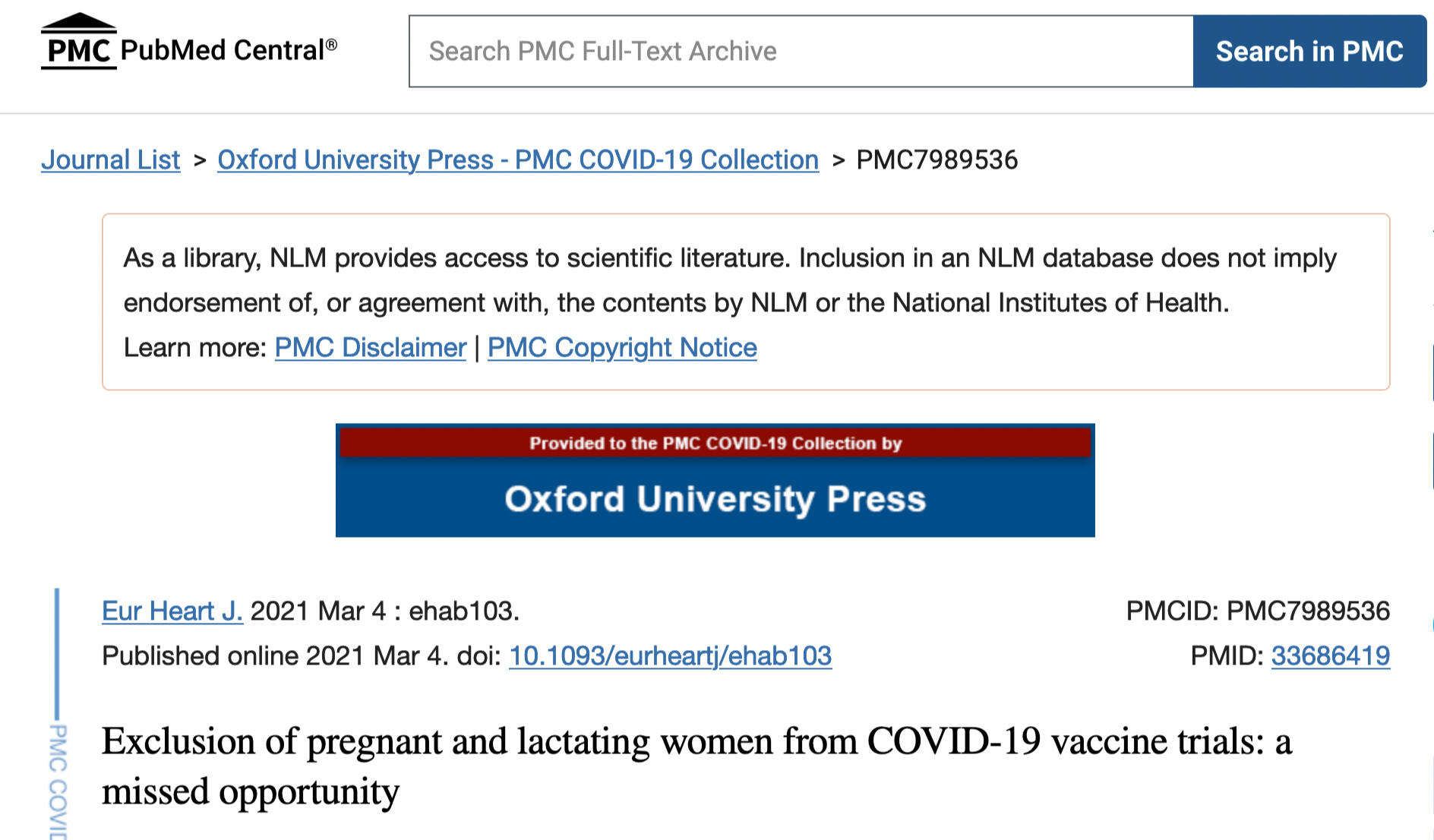 However, on March 4, 2021, the NIH comments that the exclusion of pregnant women by Pfizer and Moderna represented a "missed opportunity".